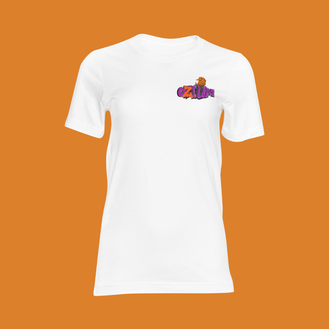 Maglietta bianca con logo Ozium lato cuore e grafica sulla schiena. Tessuto 100% cotone.